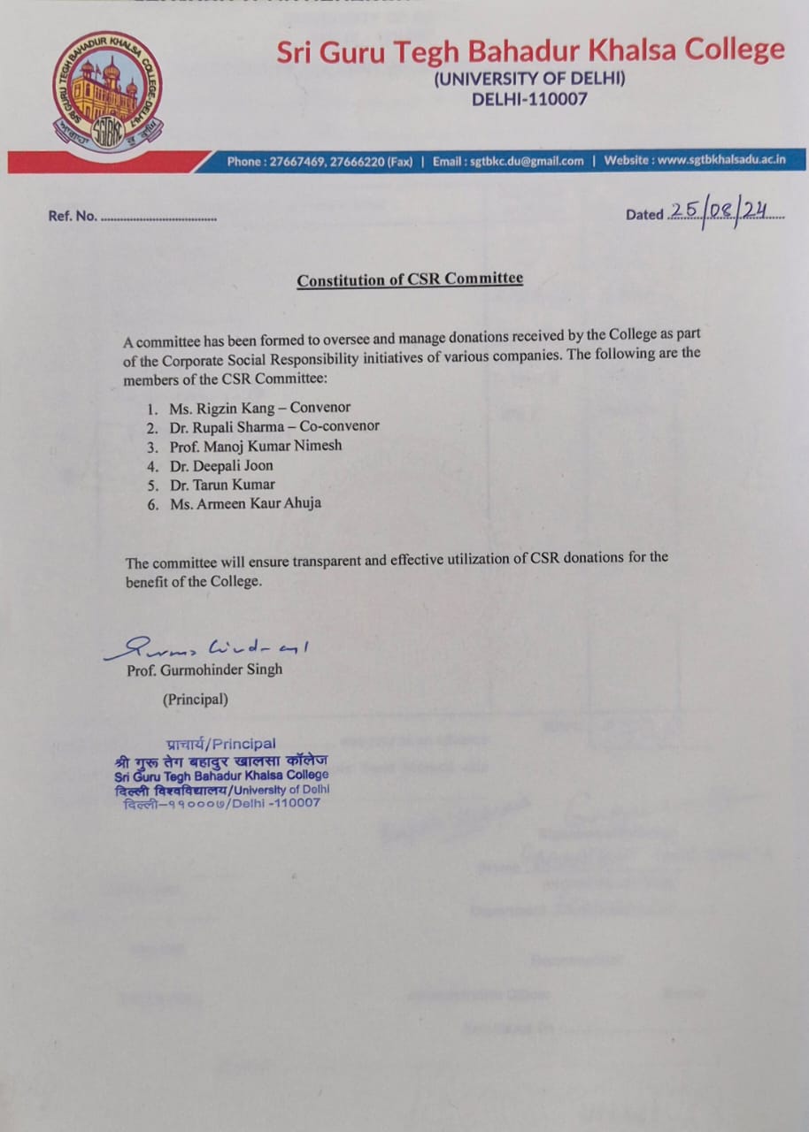 Sri Guru Tegh Bahadur Khalsa College recognises the significance of Corporate Social Responsibility (CSR) initiatives in the development of a better society. CSR Committee has been formed with the objective of utilizing this potential and encouraging companies to come forward and make their contributions towards enhancement of various aspects of the college such as supporting research and innovation, providing state of the art equipment, fund scholarships for needy and deserving students, make the college more accessible and inclusive, assist green initiatives and other endeavours along the same lines.